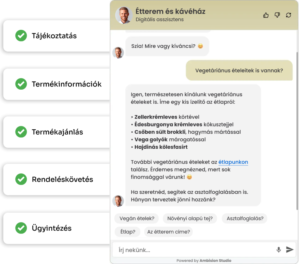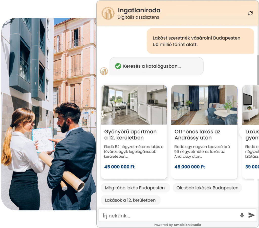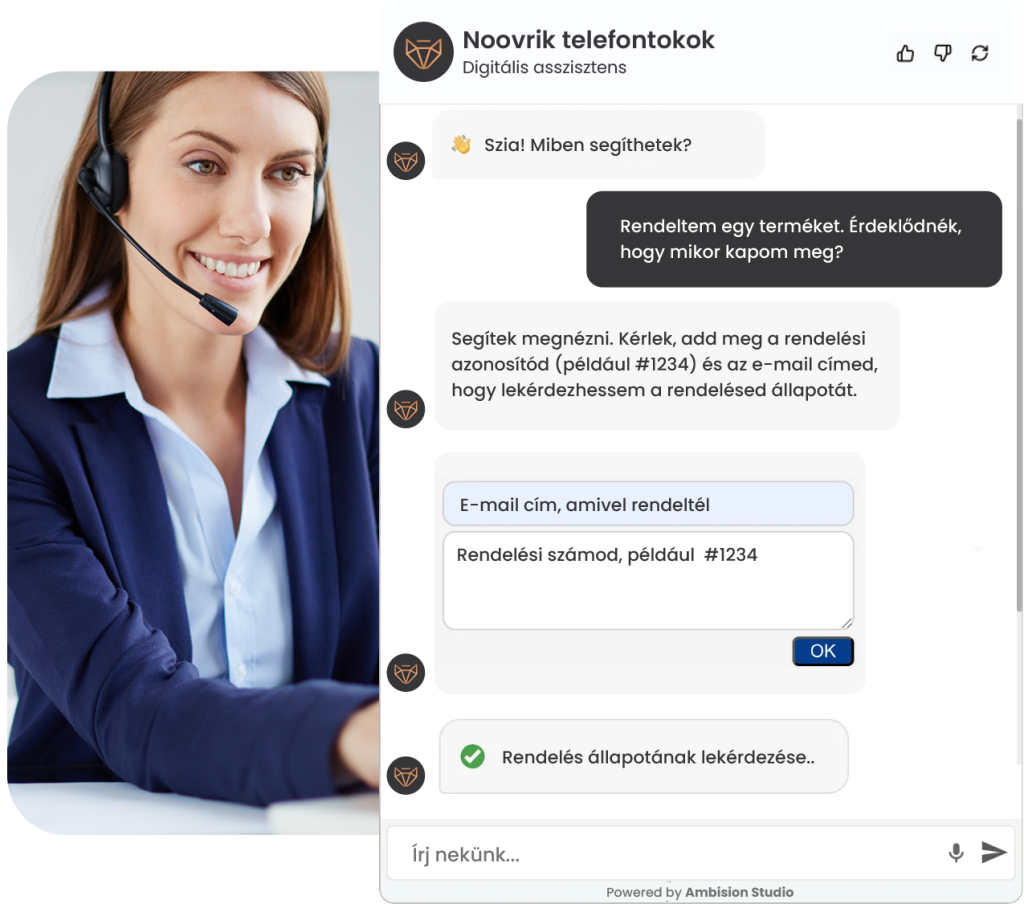 Az Ambision Studio digitális asszisztense éjjel-nappal dolgozik helyetted. Válaszol, értékesít és tehermentesít.