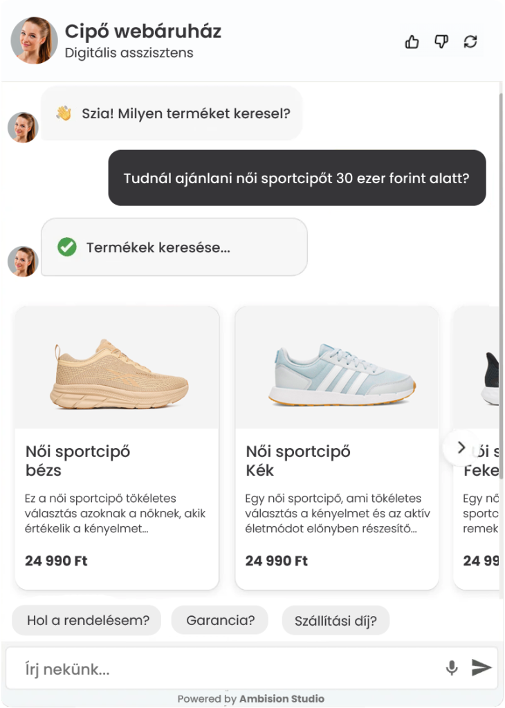 A digitális asszisztensed kezeli a kérdéseket, segíti az értékesítést, követi a rendeléseket, csökkenti a terhelést és végre több szabadidőd lehet.